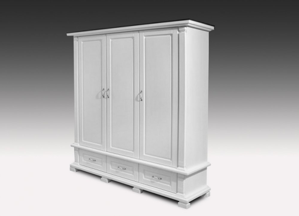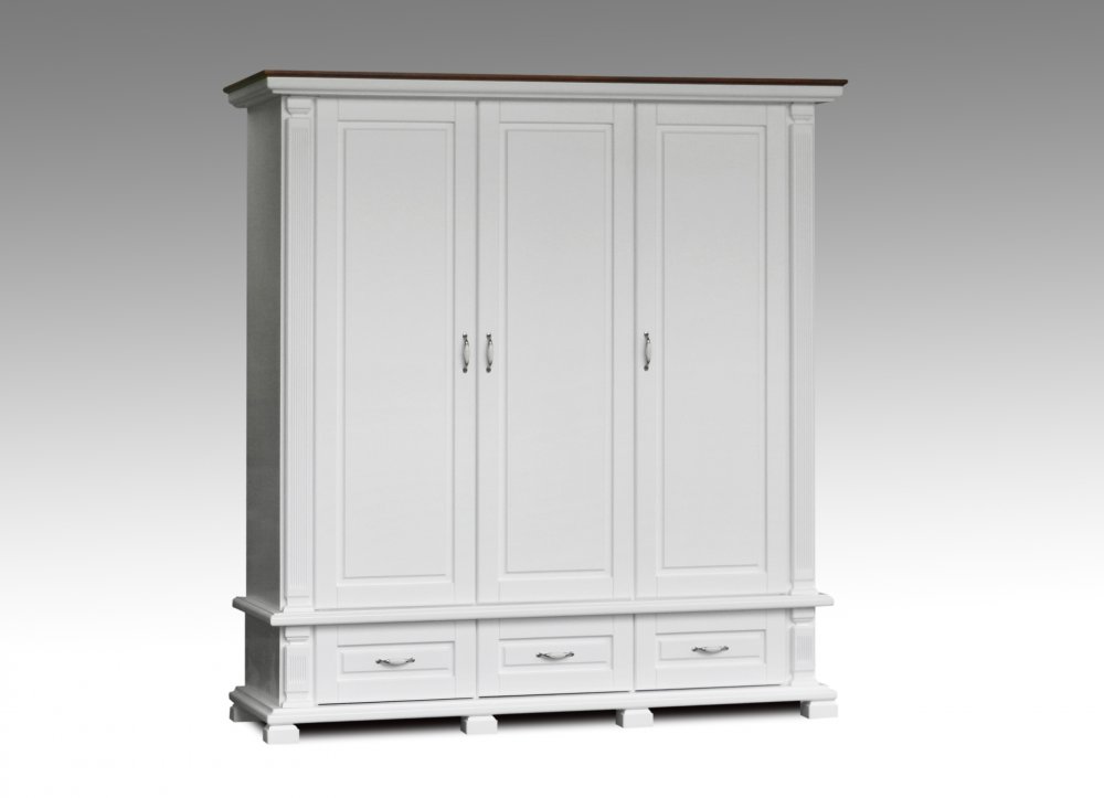 Stylizowana biała szafa trzydrzwiowa z szufladami. Stylizowana biała szafa trzydrzwiowa z szufladami.