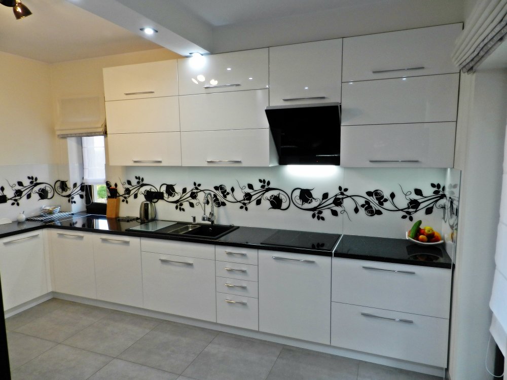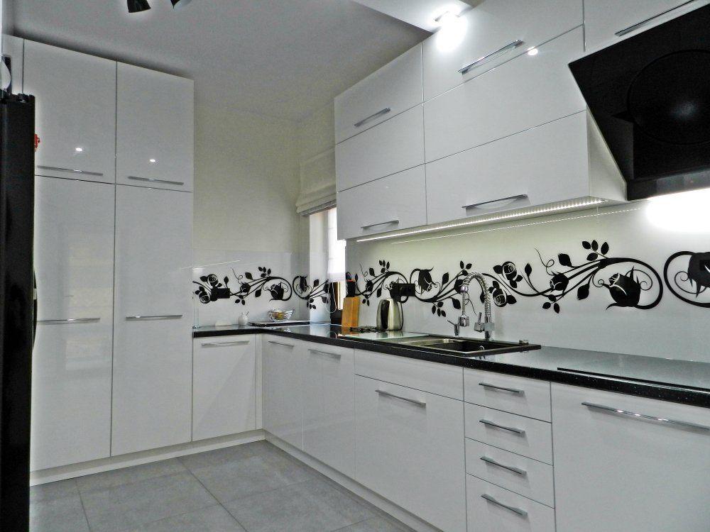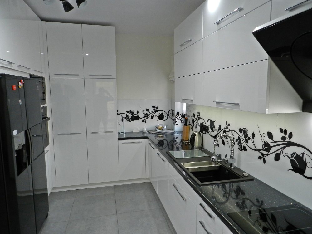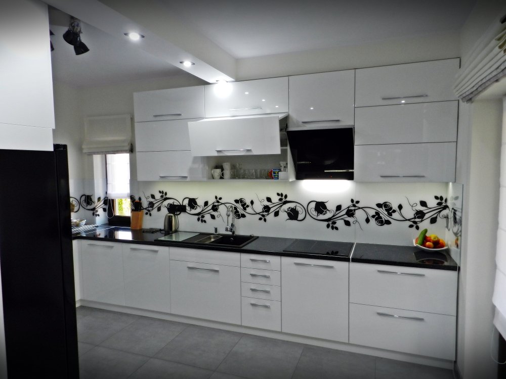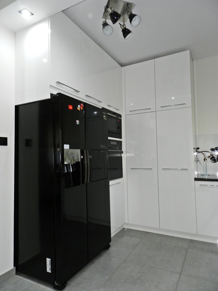 Czarny sprzęt w kontraście białego frontu kuchni na połysk