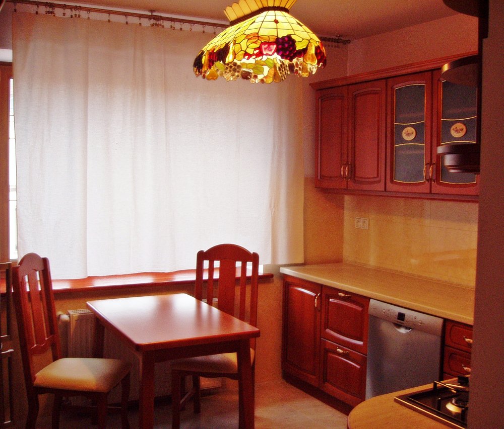 Pełna ciepa i przytulna kuchnia w barwie antycznej czereśni.